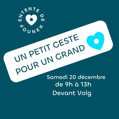 🩵Un petit geste pour un grand cœur 🩵 L’Entente de Founex organise samedi 20 décembre, de 09h00 à 13h00, une collecte de denrées alimentaires destinée aux personnes dans le besoin, devant Volg. Les dons seront intégralement reversés au Carton du Cœur Léman Ouest . ✨ Un paquet apporté, c’est un sourire offert. Venez partager ce […]